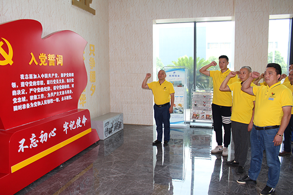 之后,三名新黨員在黨旗下莊嚴(yán)宣誓,全體黨員重溫入黨誓詞。